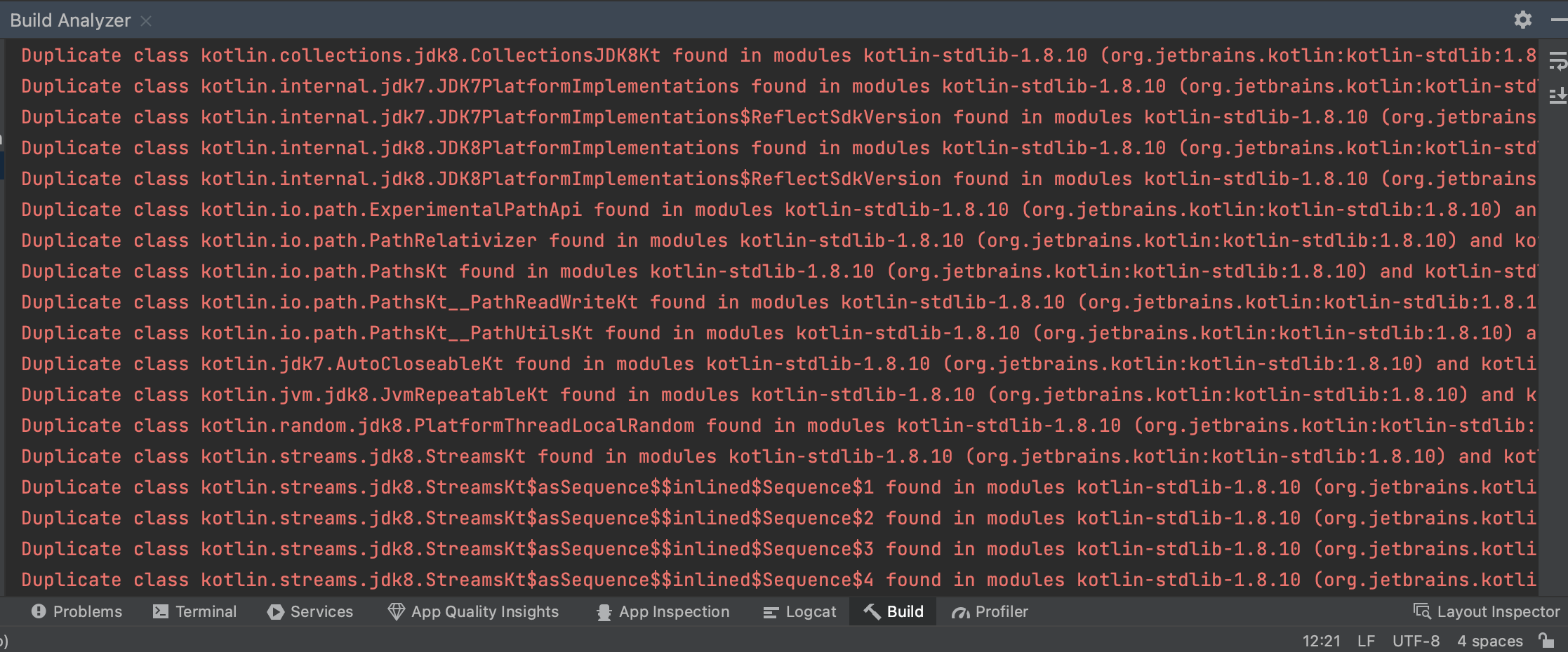 Duplicate class kotlin.io.path.ExperimentalPathApi found in modules kotlin-stdlib-1.8.10 (org.jetbrains.kotlin:kotlin-stdlib:1.8.10) and kotlin-stdlib-jdk7-1.6.21 (org.jetbrains.kotlin:kotlin-stdlib-jdk7:1.6.21)